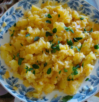 Entretanto, cozem-se as batatas, sem deixar ficar muito moles. Pisam-se com um garfo (eu gosto assim como se vê na foto, não muito desfeita).